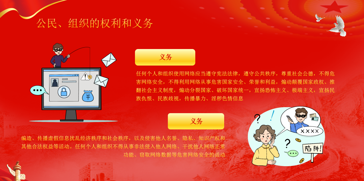 在網(wǎng)絡(luò)安全保障體系中,公民與組織依法享有的權(quán)利可分為"積極權(quán)利"與"消極權(quán)利"兩大維度,這兩類(lèi)權(quán)利共同構(gòu)筑了網(wǎng)絡(luò)空間的權(quán)益保護(hù)網(wǎng)。網(wǎng)絡(luò)安全不是某一個(gè)人的事,而是我們每個(gè)人都要守護(hù)的共同責(zé)任。作為公民和組織,在網(wǎng)絡(luò)空間里該怎么做、不該怎么做,其實(shí)有著清晰的“行為指南”。我們可以把這些責(zé)任分成三個(gè)層面來(lái)記:首先是必須守住的“底線(xiàn)義務(wù)”,其次是絕對(duì)不能碰的“禁止行為”,最后是千萬(wàn)別忽視的“協(xié)助責(zé)任”。